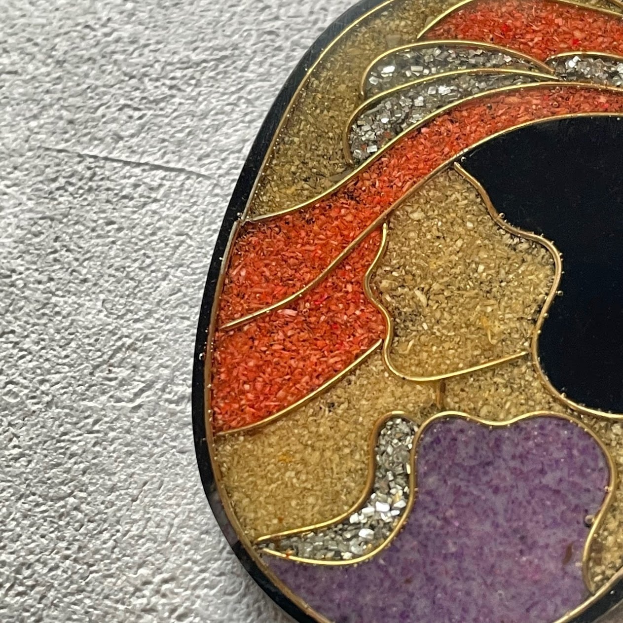 砂を使い手作業で作る、サンドアートで描かれた女性が目を引くブローチです。