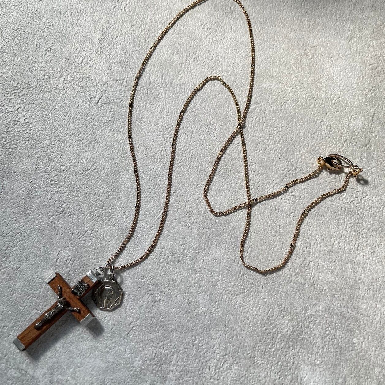 クラッシックな雰囲気のクロスとメダイがセットになったイタリアヴィンテージのネックレスです。