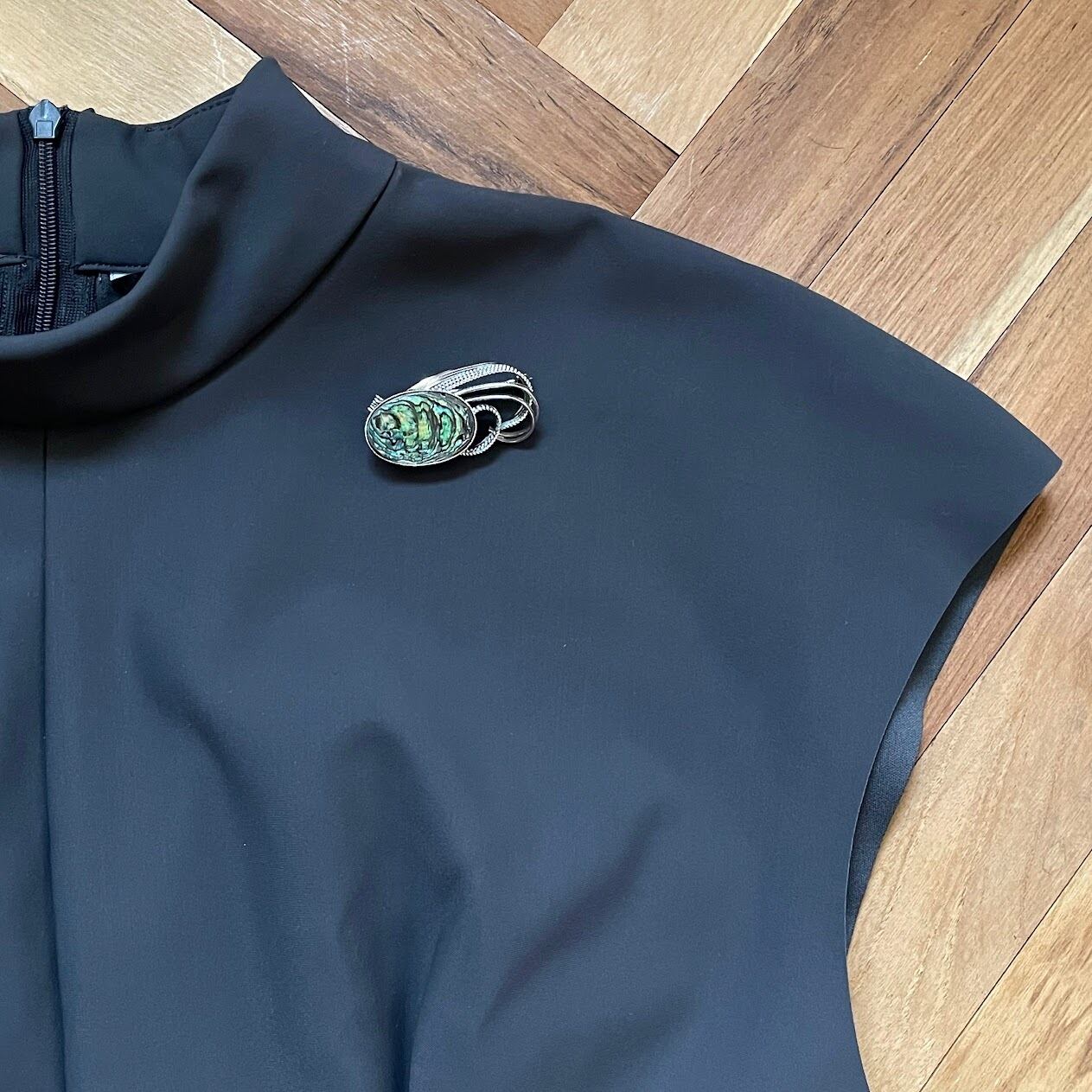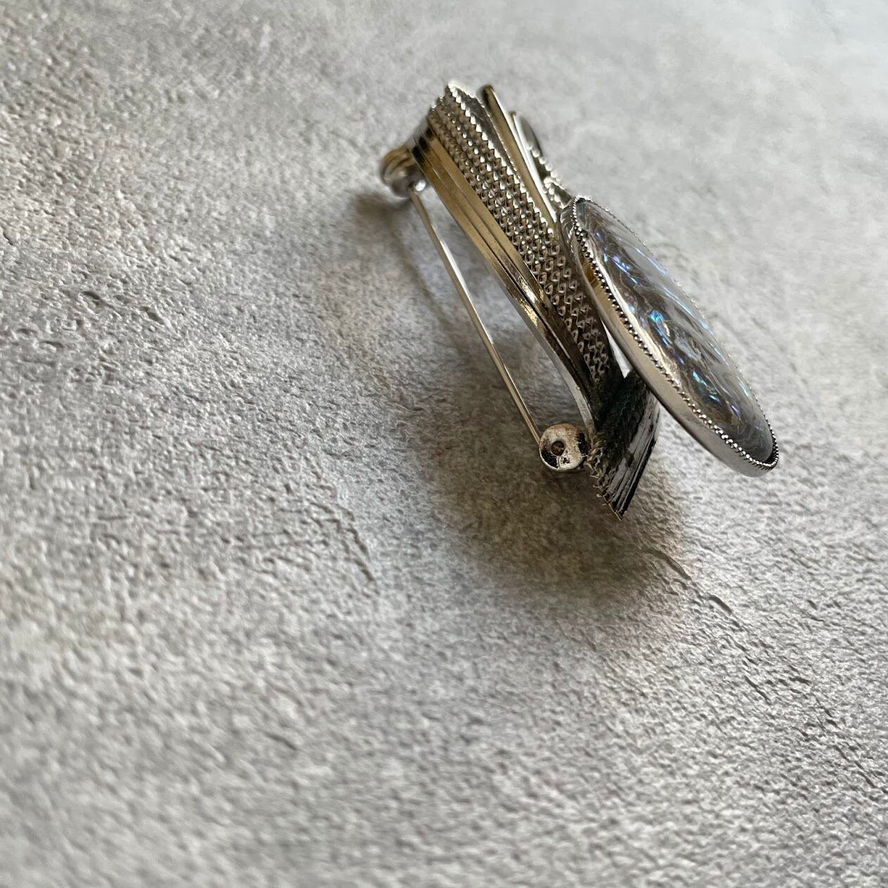 表面の艶感と、見る角度によって変わる輝きが目を引くシェルのブローチです。