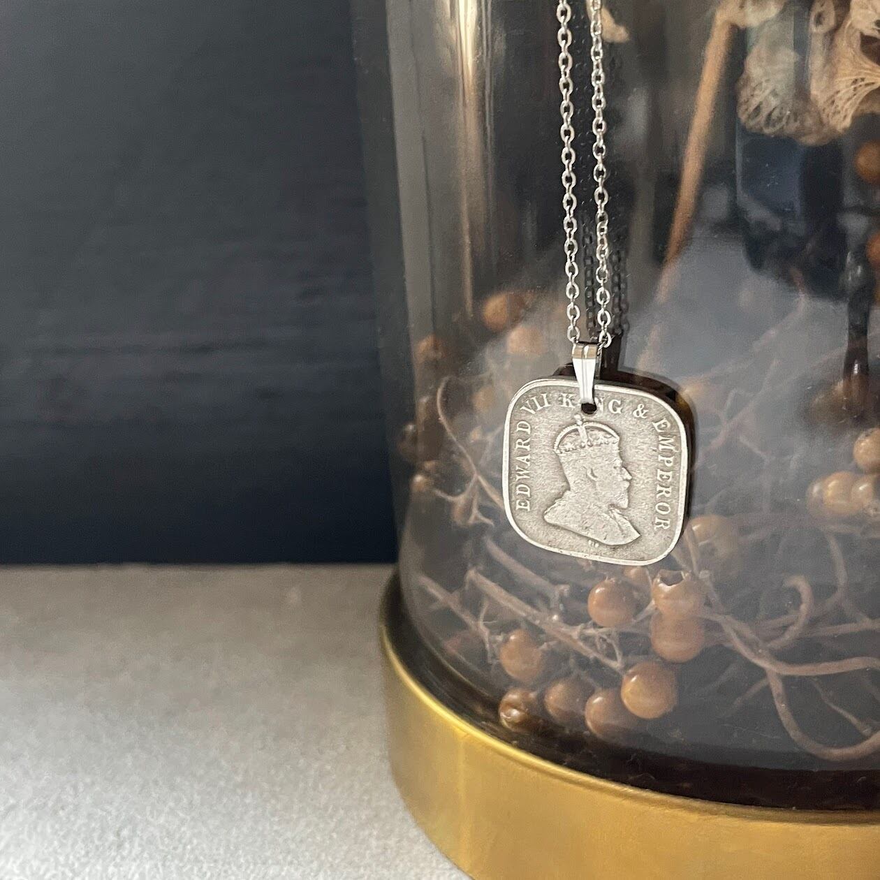 セイロン(現スリランカ)で1910年に発行されたヴィンテージコインをリメイクして作られた、ハンドメイドのネックレスです。