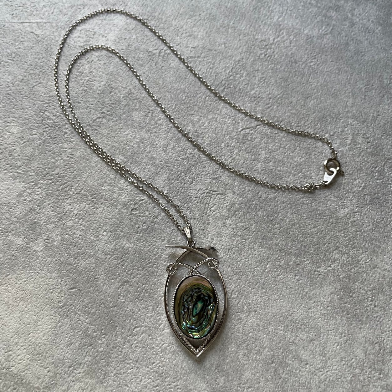 オーバル型のメタルにシェルが埋め込まれた、反射の色合いで輝きが変わるネックレスです。