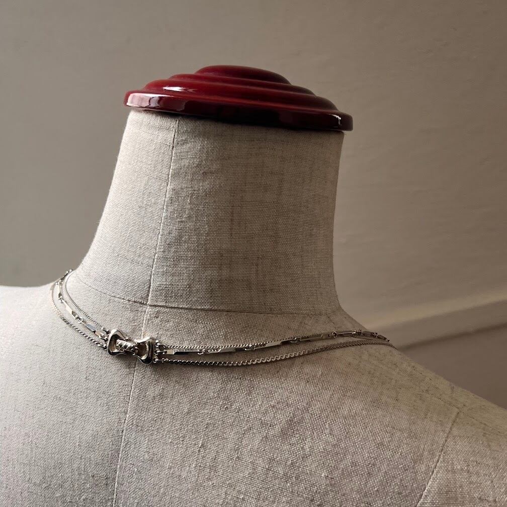 異なる3つのチェーンを使った重ね付けしているように見える3連のネックレスです。