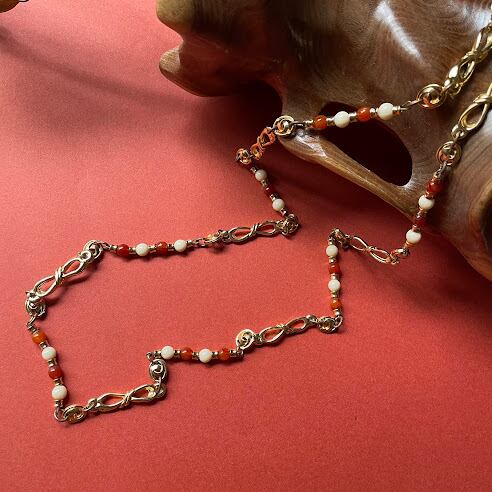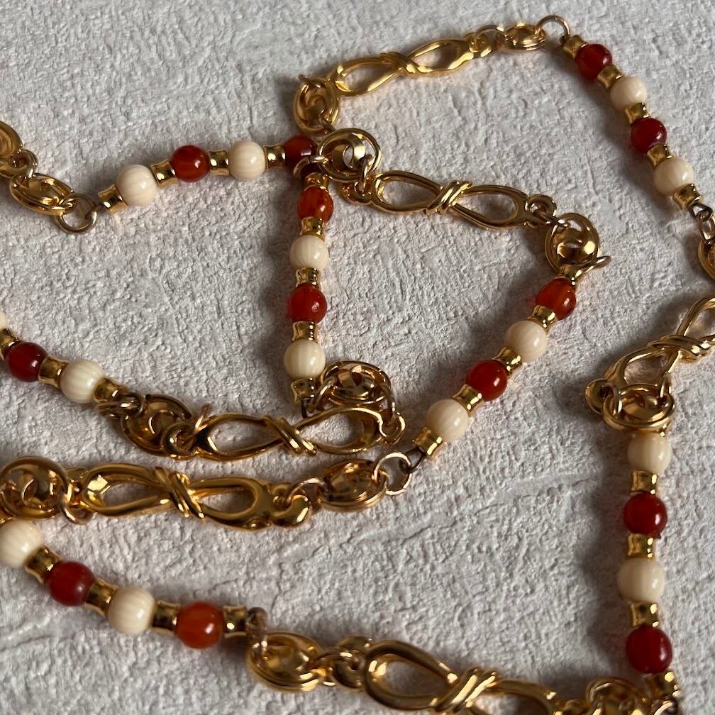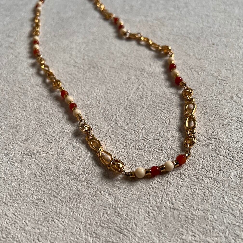 リボンパーツと天然石を繋げたヴィンテージ感あるネックレスです。