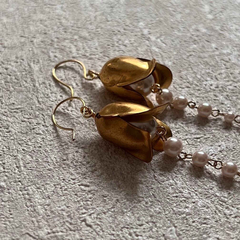 雰囲気ある真鍮の色合いと、上品に揺れるパールが魅力のピアスです。