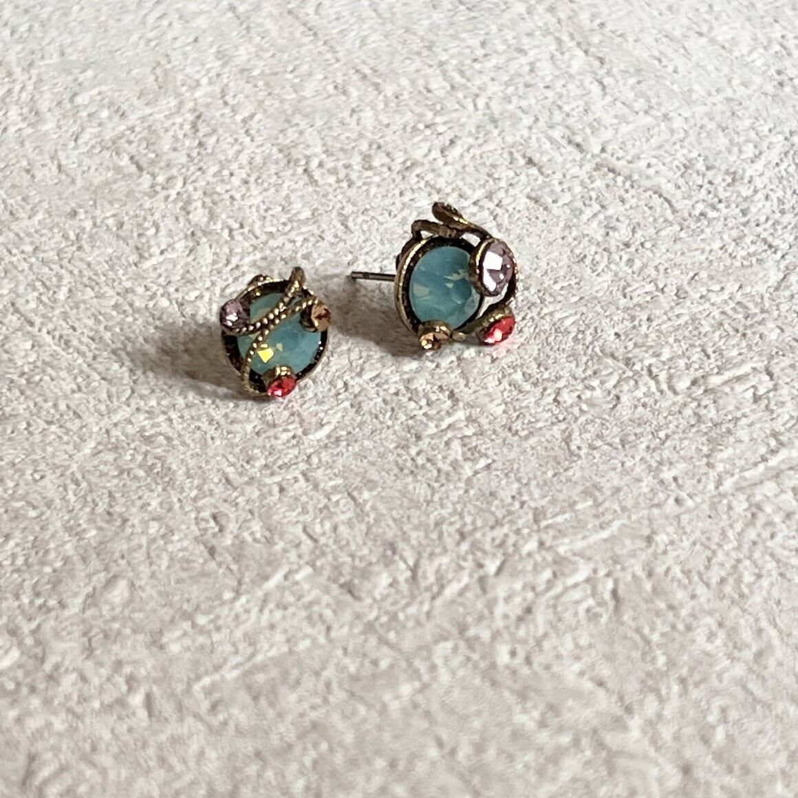 ブルーグリーンのガラスの上に立体的にデザインされたワイヤーがろう付けされた、奥行きのあるデザインが魅力のピアスです。