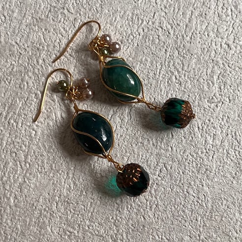 グリーンの色合いがきれいな、天然石とガラスを使ったピアスです。