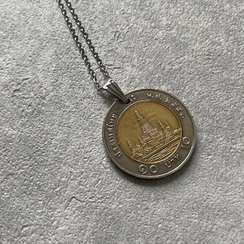 タイで1995年に発行されたヴィンテージコインをリメイクして作られた、ハンドメイドのネックレスです。