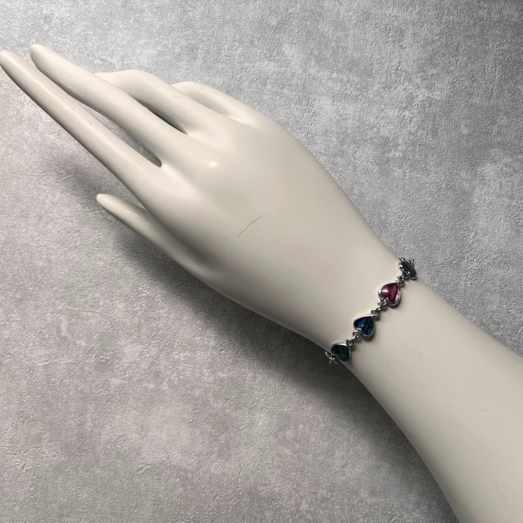 ハートの型のメタルにシェルが埋め込まれた、反射の色合いで輝きが変わるブレスレットです。