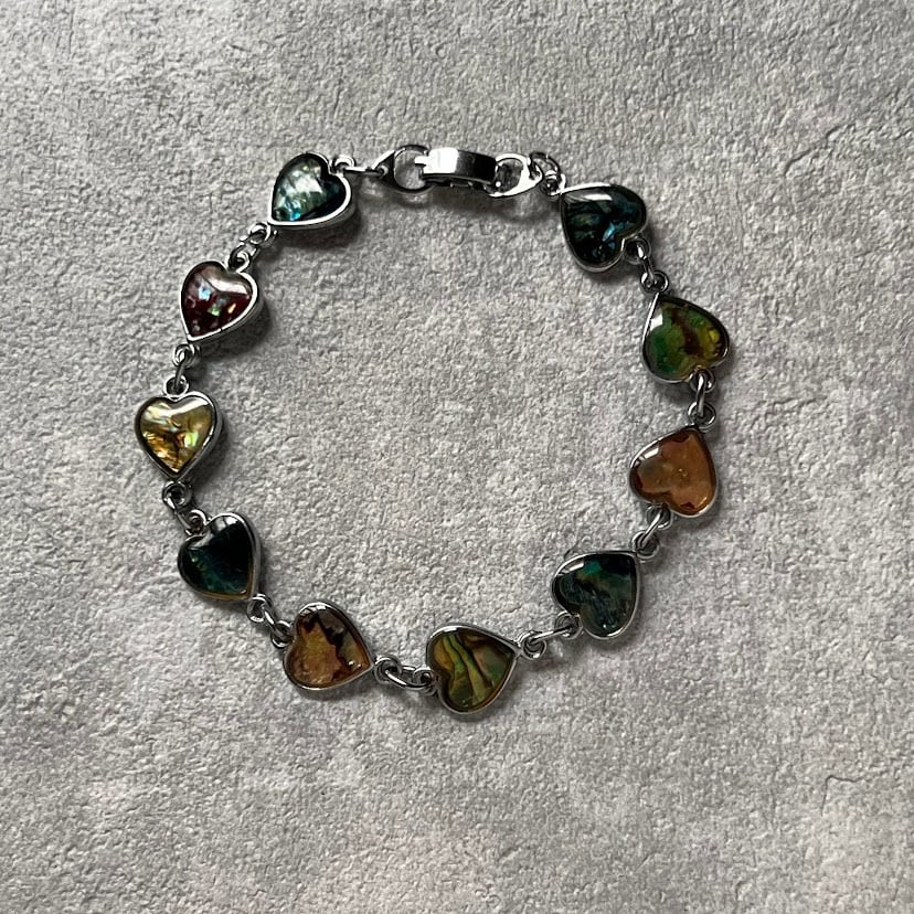 ハートの型のメタルにシェルが埋め込まれた、反射の色合いで輝きが変わるブレスレットです。