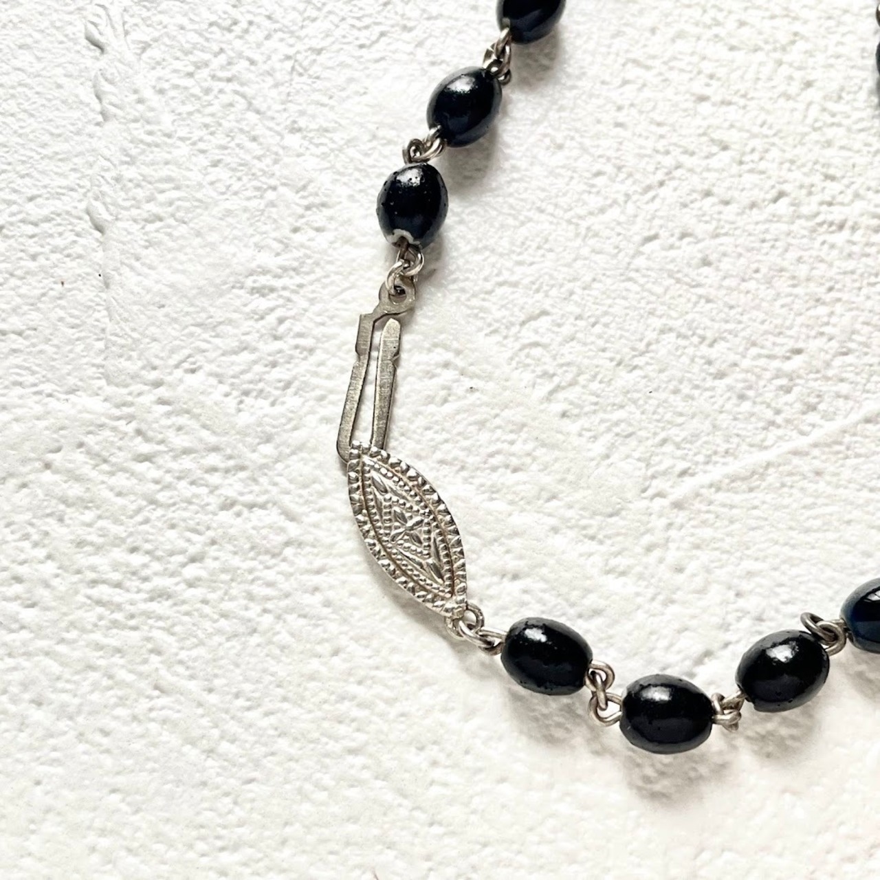 留め具は着脱が簡単なバネ式クラスプです。着ける時はクリップ部分をカチッというまで差し込み、外す時はクリップ部分を軽く押して引っ張ると外れます。
