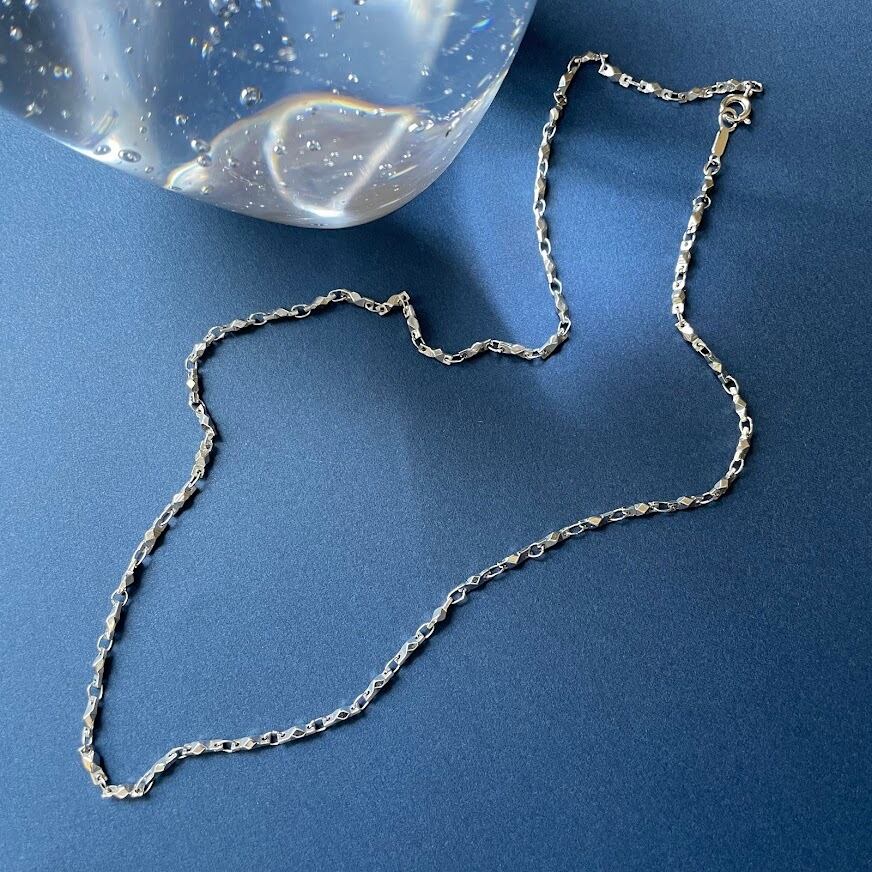 カットが入ったパーツが繋がったデザインチェーンのネックレスで、合金の上にプラチナを厚くコーティングしたプラチナフィルド仕様になっているため白く落ち着いた輝きがあります。