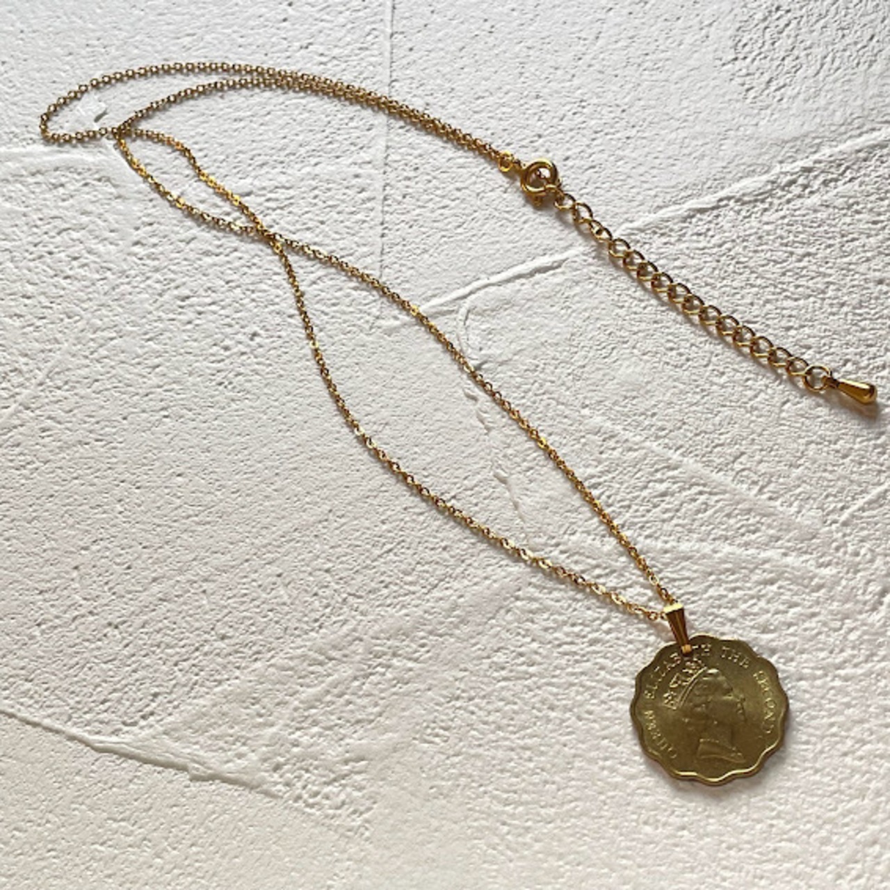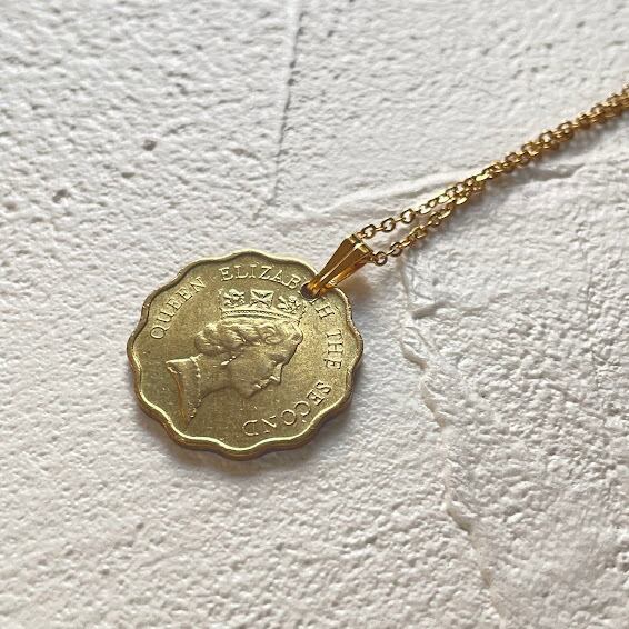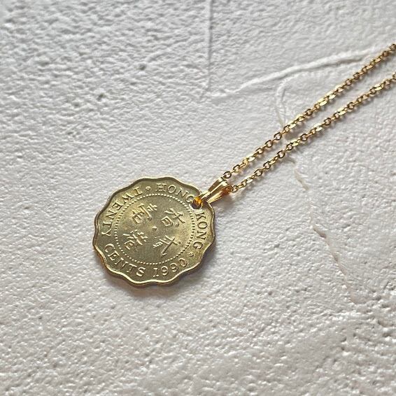 香港で1990年に発行されたヴィンテージコインをリメイクして作られた、ハンドメイドのネックレスです。