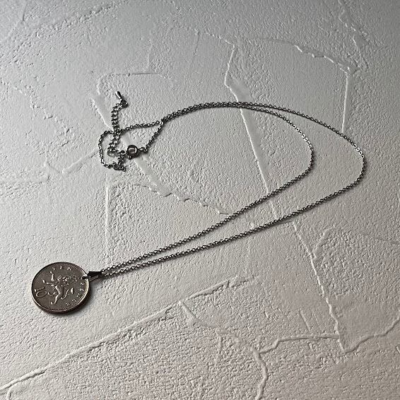 イギリスで1992年に発行されたヴィンテージコインをリメイクして作られた、ハンドメイドのネックレスです。