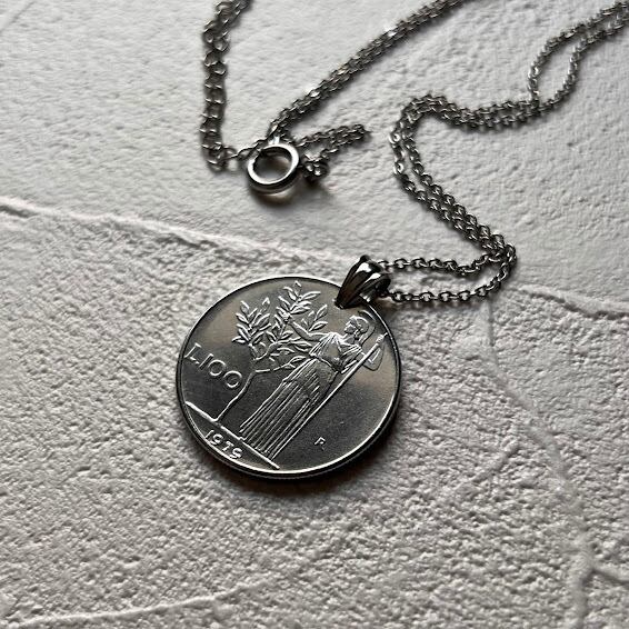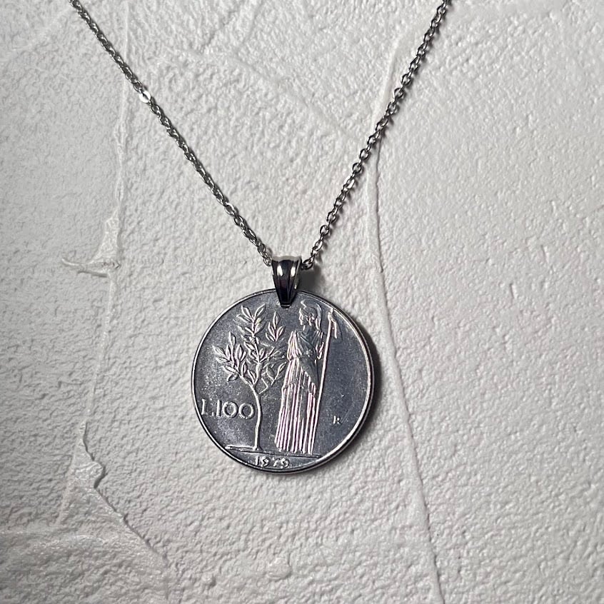 イタリアで1979年に発行されたヴィンテージコインをリメイクして作られた、ハンドメイドのネックレスです。