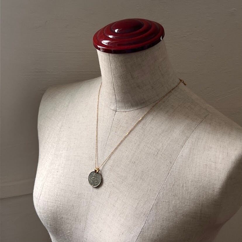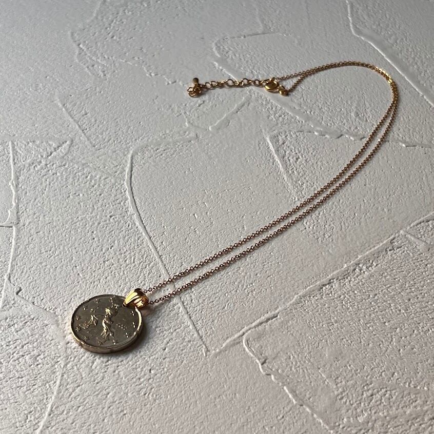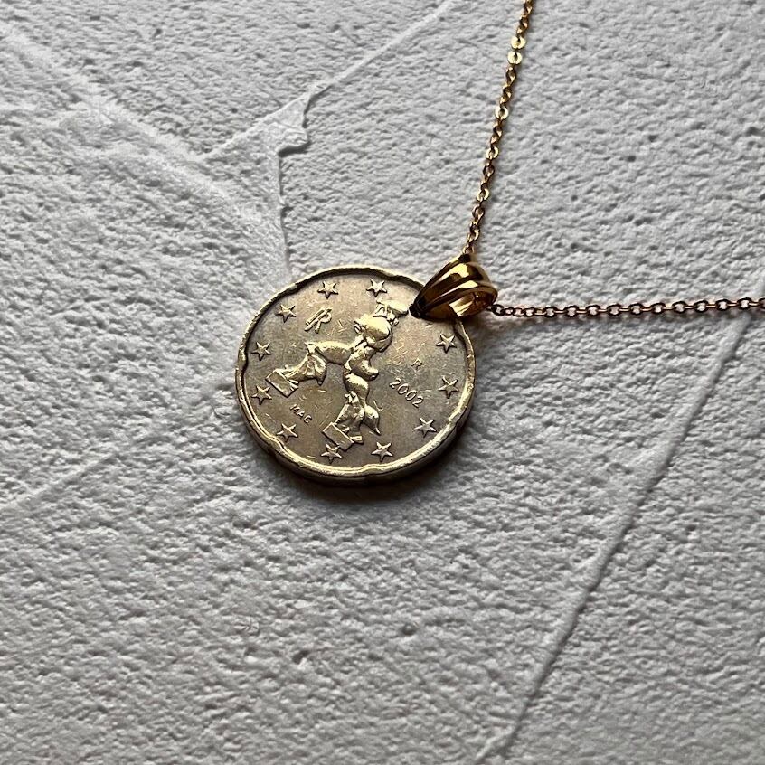 イタリアで2002年に発行されたヴィンテージコインをリメイクして作られた、ハンドメイドのネックレスです。