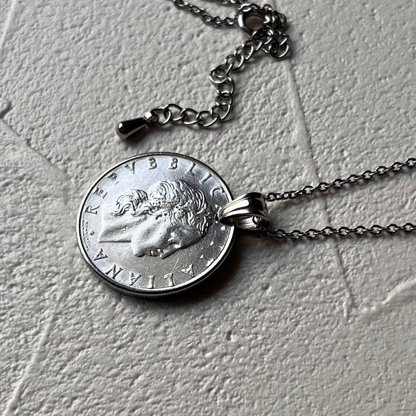 イタリアで1978年に発行されたヴィンテージコインをリメイクして作られた、ハンドメイドのネックレスです。