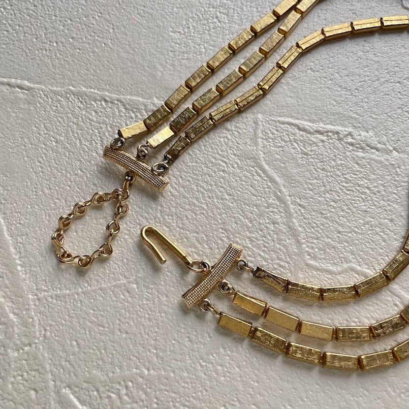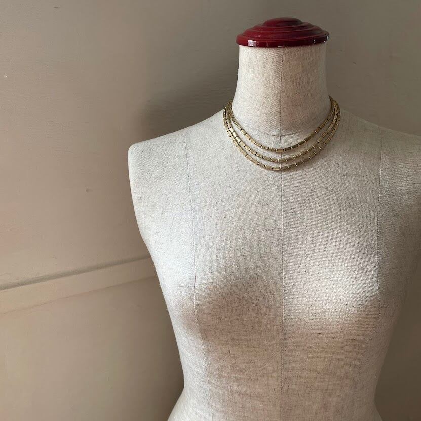 テクスチャーの入ったレクタングルパーツが雰囲気ある3連のネックレスです。