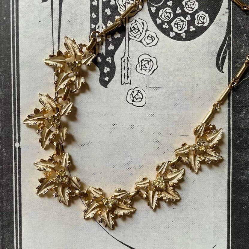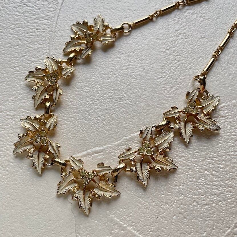 白く色付けされたリーフパーツを繋げた、ボタニカルデザインのネックレスです。