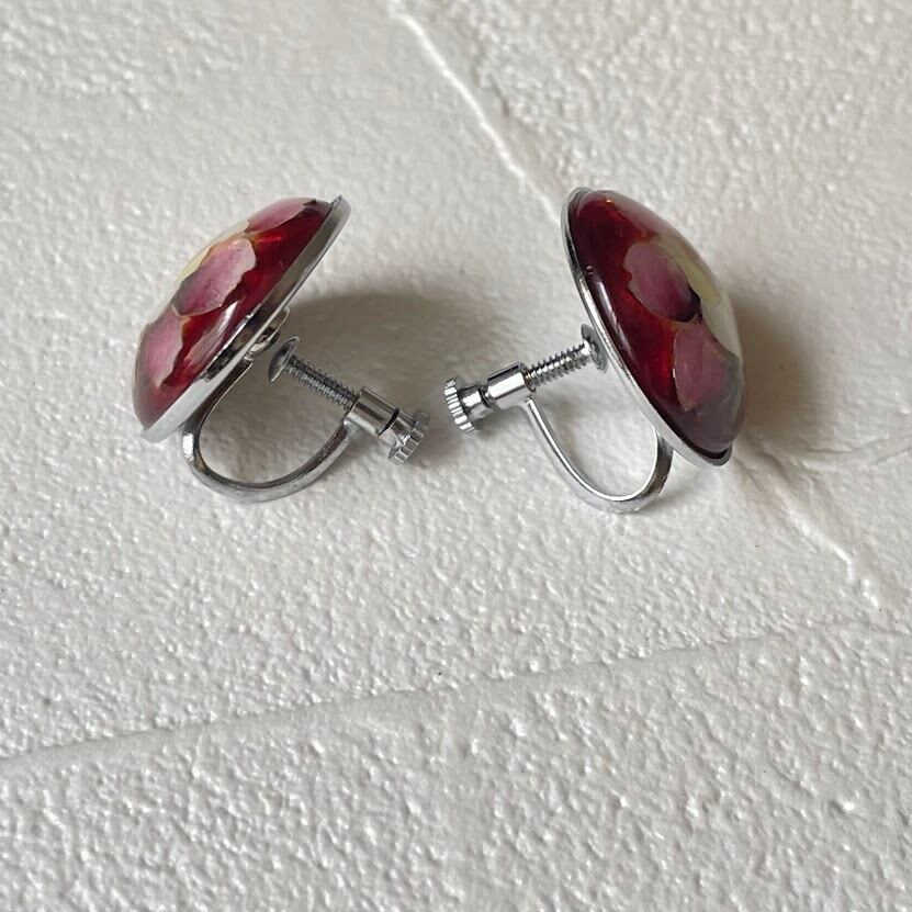 レトロな雰囲気の花が描かれた、艶感がある七宝焼きのイヤリングです。