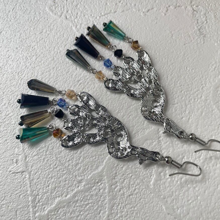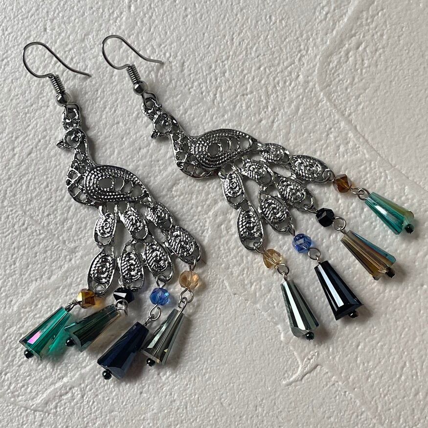 クジャクの羽を表現したカットガラスが上品に輝くピアスです。