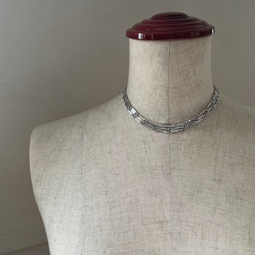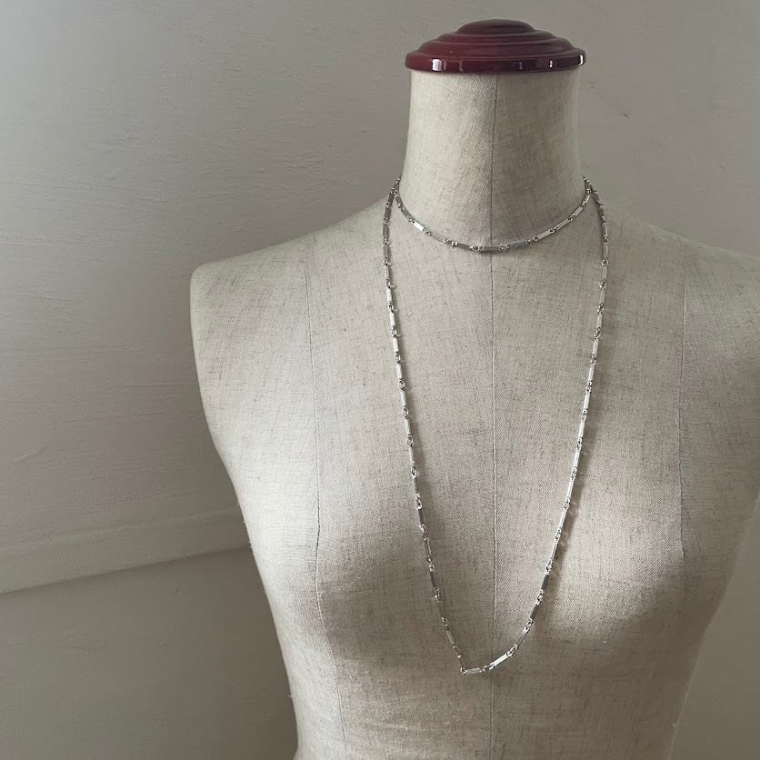 長さがあるので、2連にしたりチョーカーにしたり、タイのように結んでアレンジしたりと、その日のコーディネートによってスタイルを変えられるネックレスです。