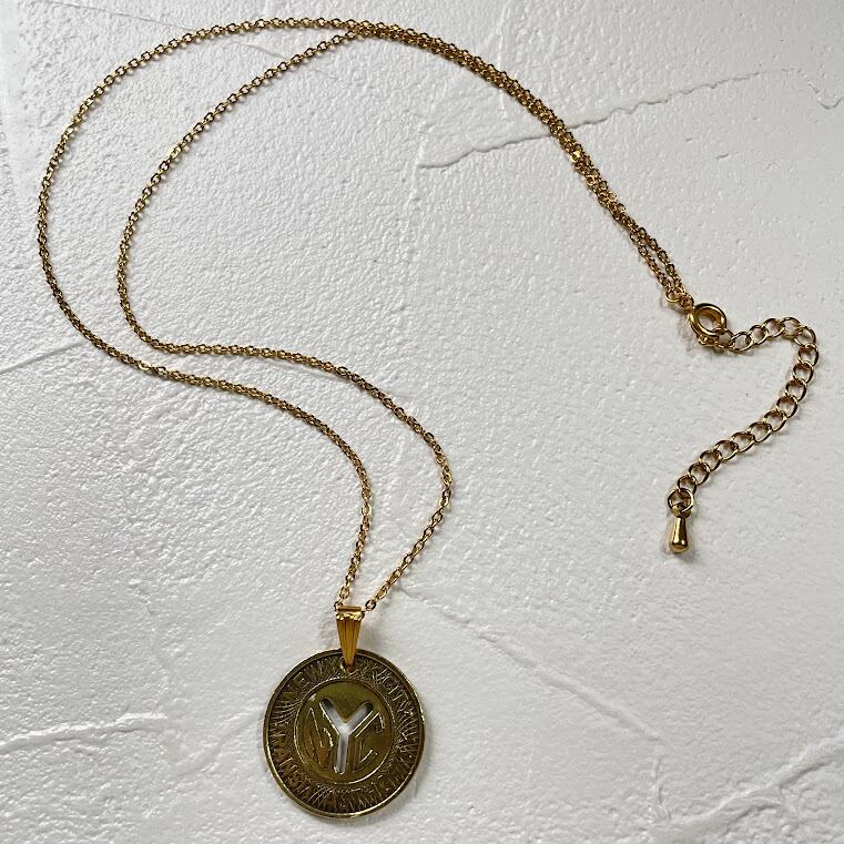 アメリカのバスや地下鉄などで使われていた、代用貨幣のヴィンテージコインをリメイクして作られた、ハンドメイドのネックレスです。