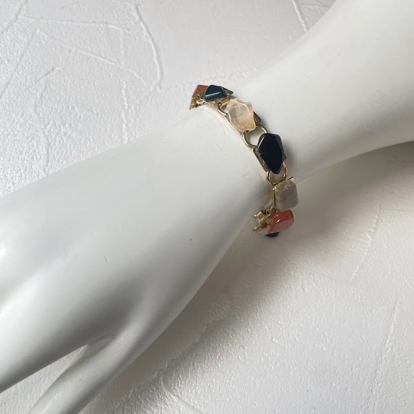 たくさんの種類の石が使われた、華やかな印象のブレスレットです。