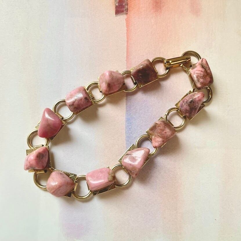 不揃いにカットされた艶感あるピンクの石が雰囲気あるブレスレットです。