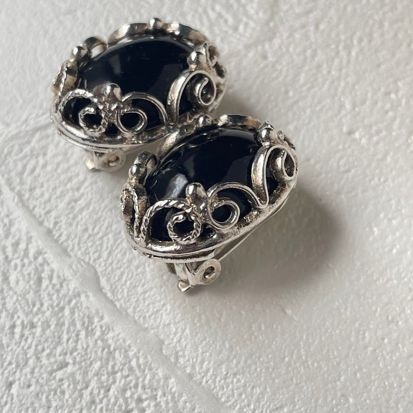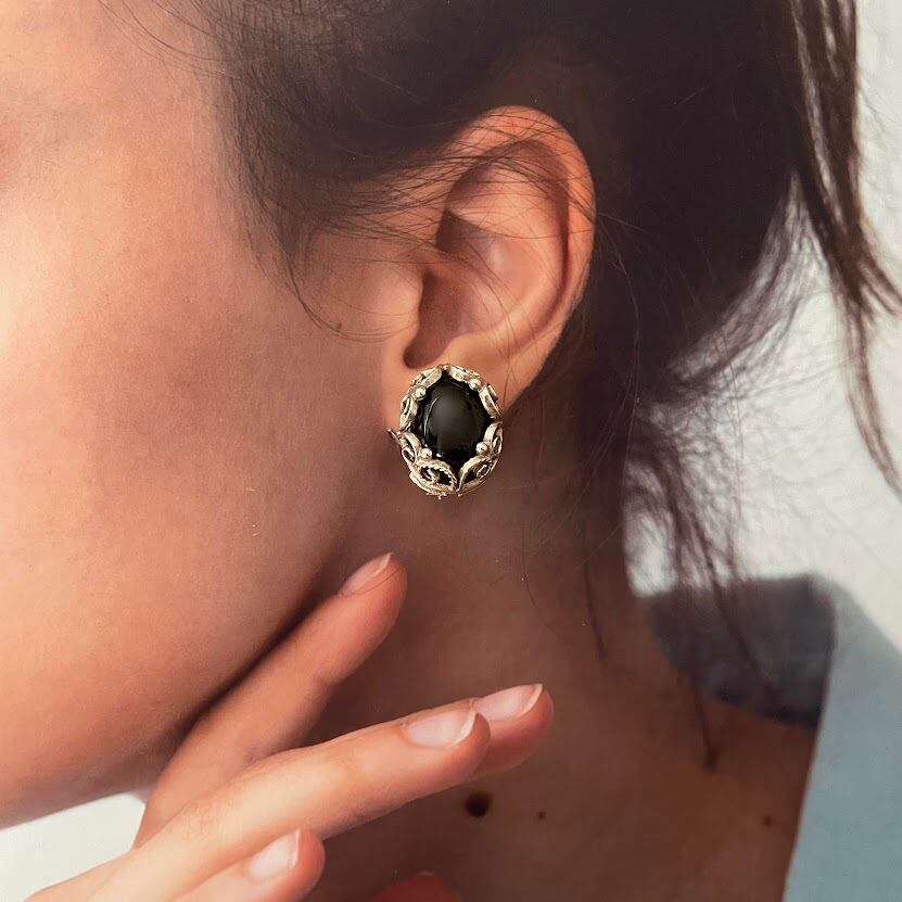 ブラックベースのカラーにカボション台座の装飾が雰囲気あるイヤリングです。