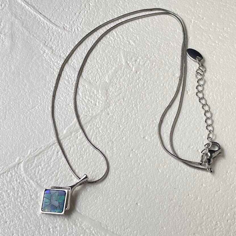 小さなオパールの薄片を集めて作っているネックレスです。光があたると上品に艶感ある輝きをはなちます。