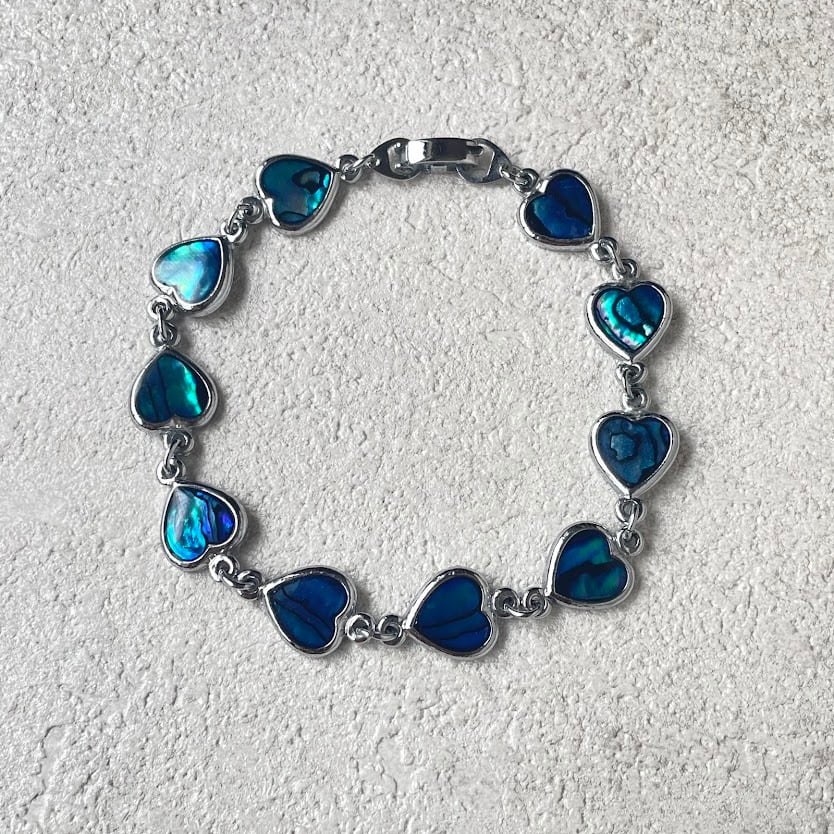 ハートの型のメタルにシェルが埋め込まれた、反射の色合いで輝きが変わるブレスレットです。