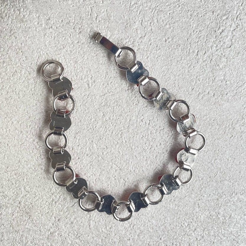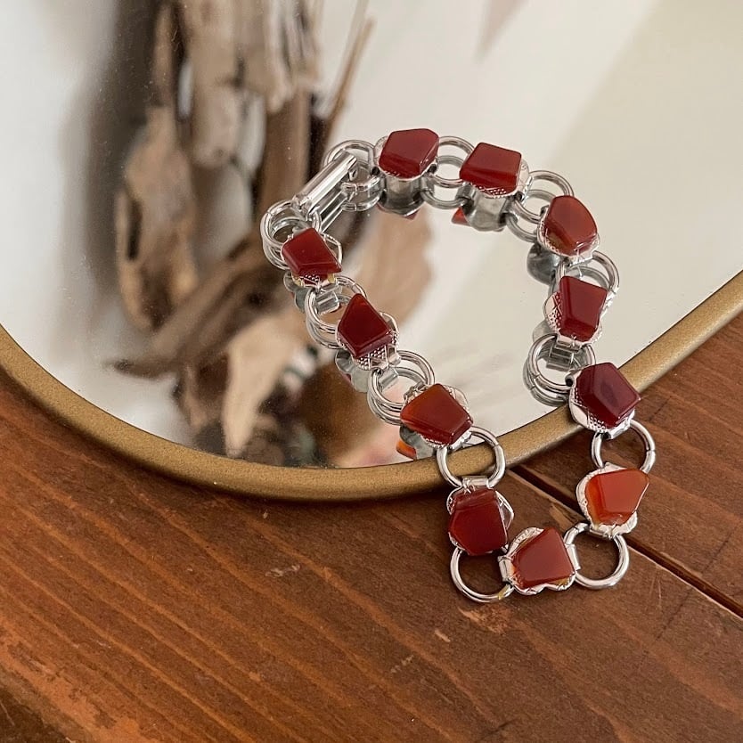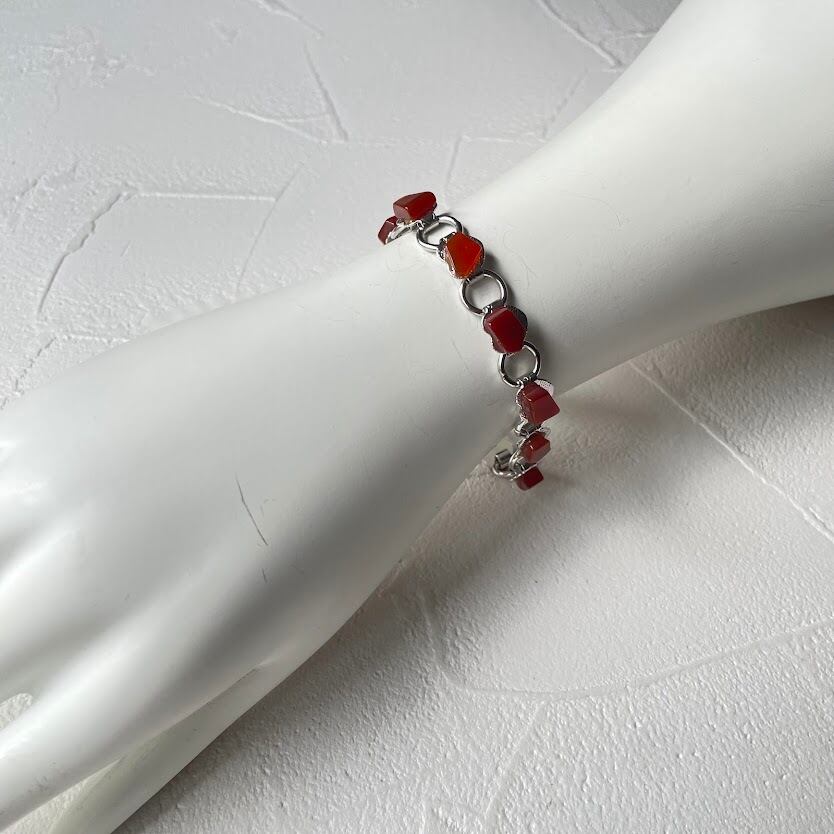 不揃いにカットされた艶感ある赤い石が雰囲気あるブレスレットです。