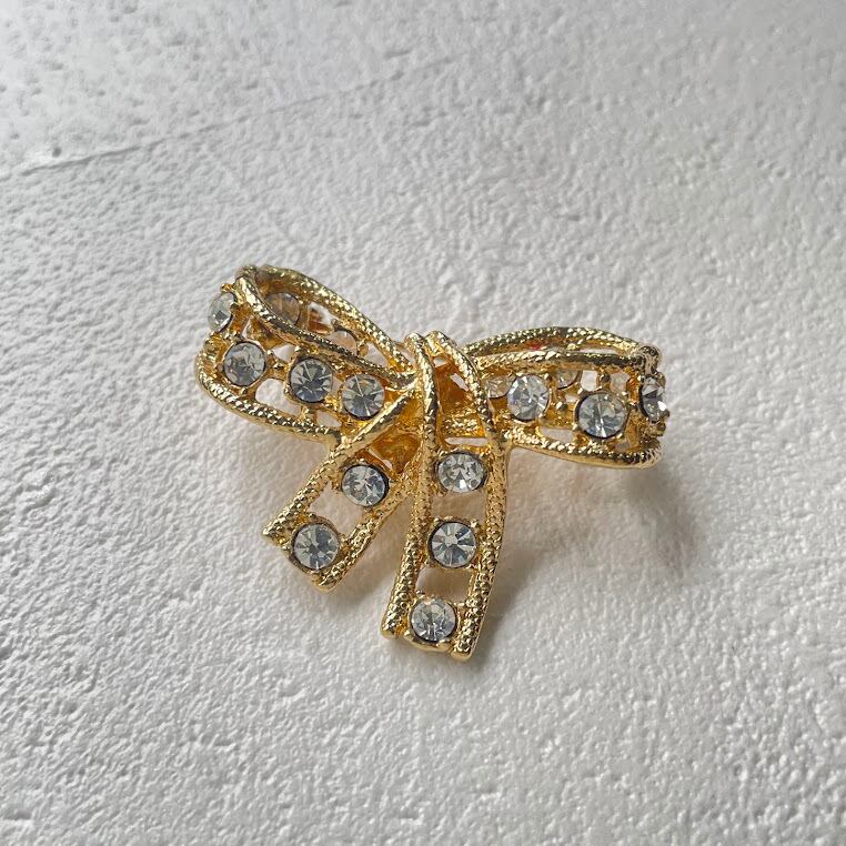立体的にデザインされたリボンと、上品に輝くラインストーンが目を引くブローチです。