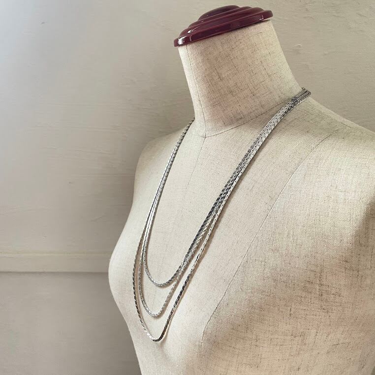 編み込んだようなチェーンを使った、重ね付けしているように見える3連のネックレスです。