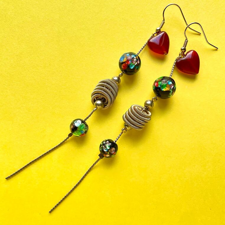 ハートのシルエットにカットされた天然石と、マルチカラーのガラスの組み合わせが魅力のピアスです。