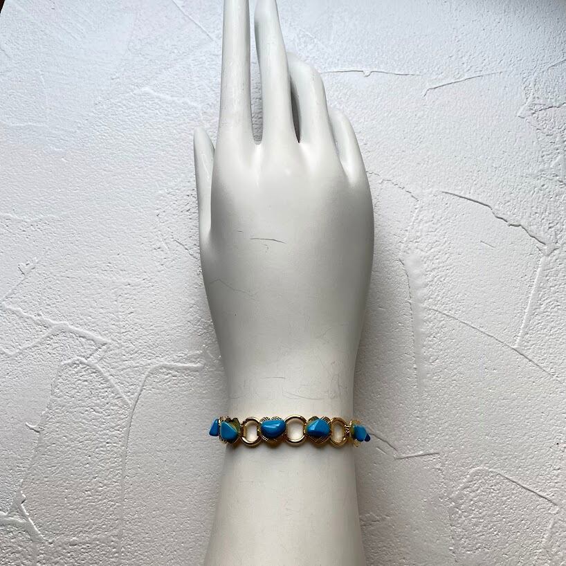 ハートベースの金具に鮮やかなブルーの石が使われた、色合いがきれいなブレスレットです。