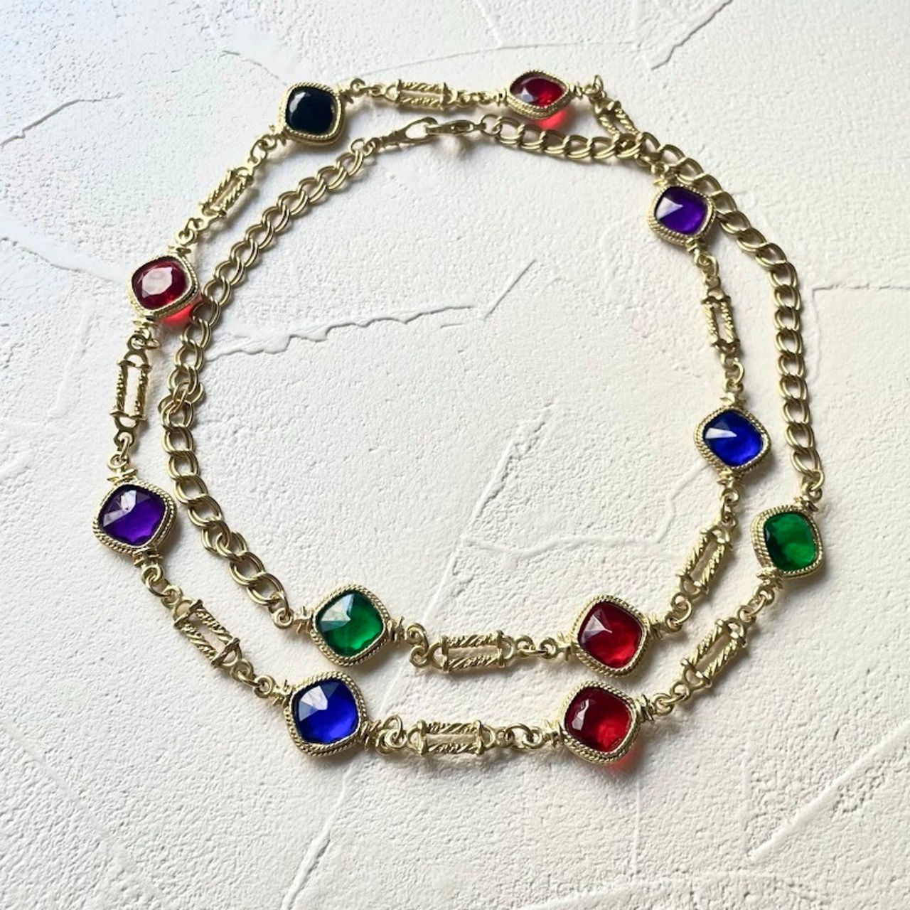 ガラスの色使いや装飾された繋ぎパーツが雰囲気あるネックレスです。