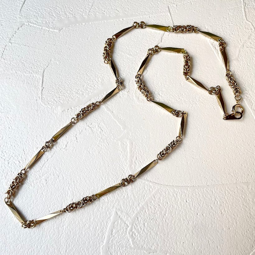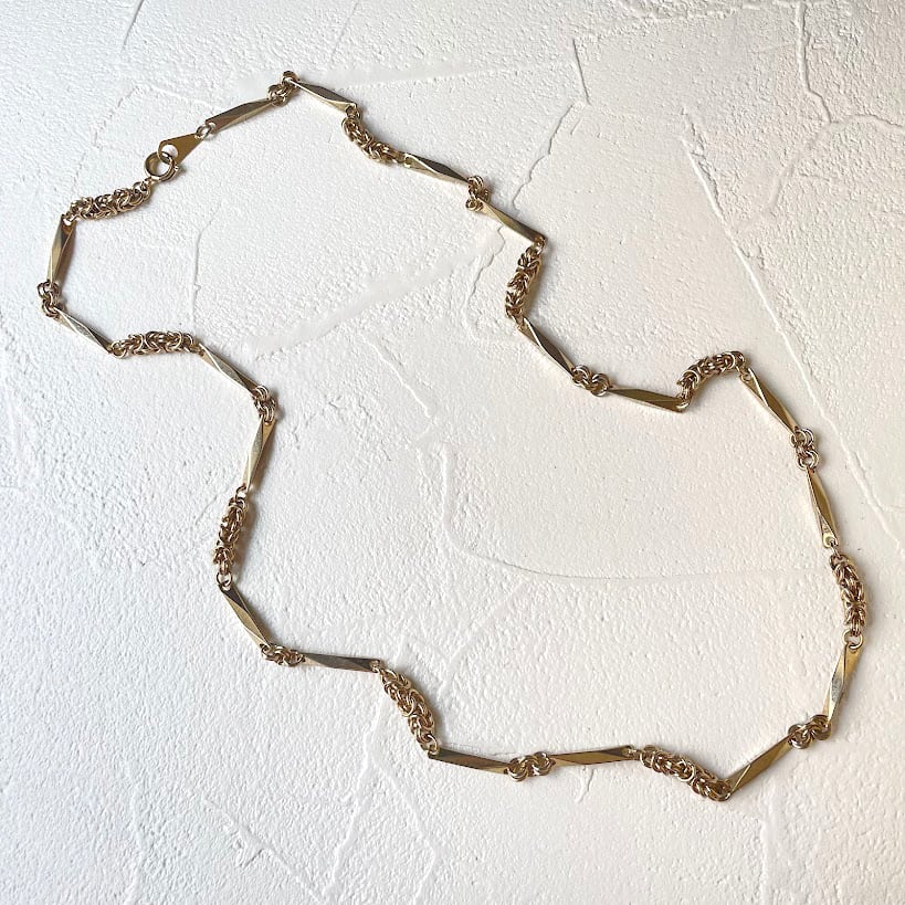 カットの入ったレクタングルパーツに、繋ぎのチェインメイルデザインが魅力のネックレスです。