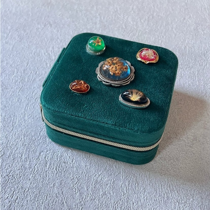 新品のジュエリーボックスに、ユーズドアクセサリーのモチーフ部分を装飾したアップサイクルアイテム。