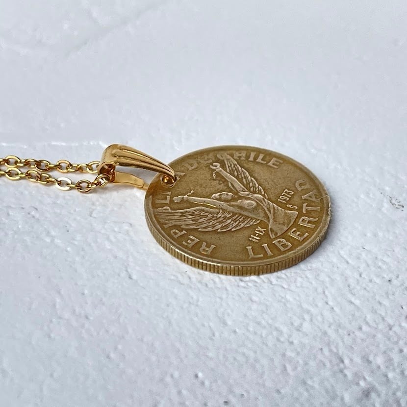 チリで1973年に発行されたヴィンテージコインをリメイクして作られた、ハンドメイドのネックレスです。