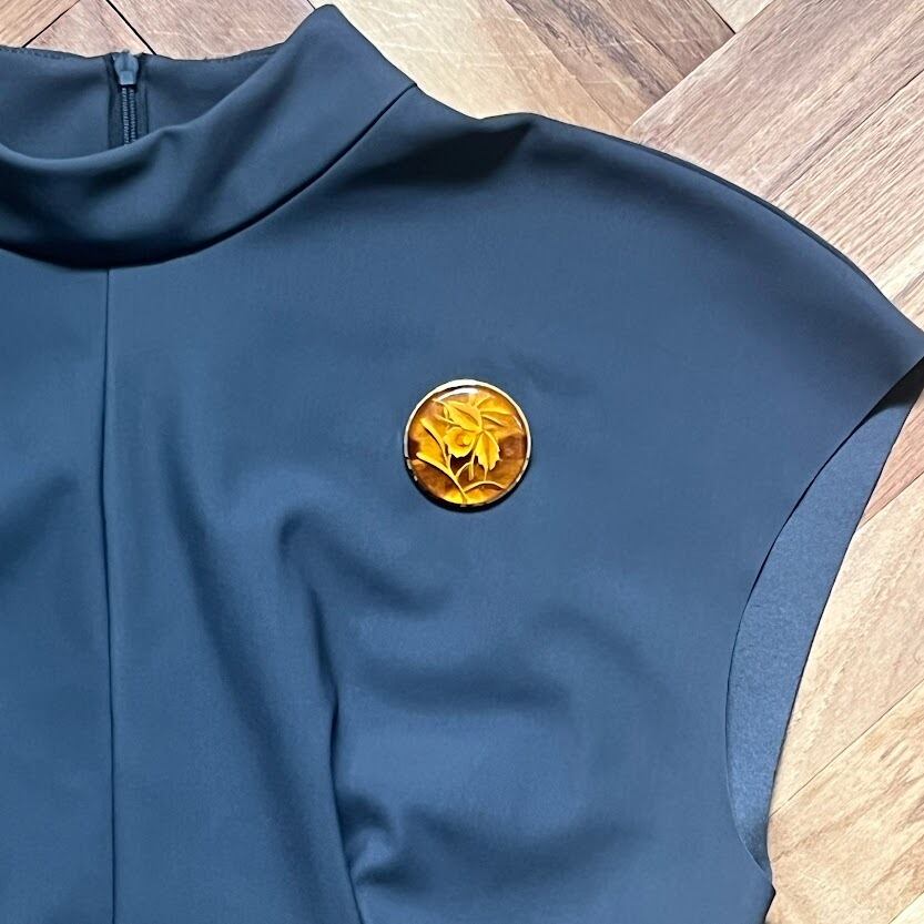 ピン部分は、回転ブローチピン式で、針の先端部分をロックすることができ、つけている間に外れてしまう心配が少ないタイプです。