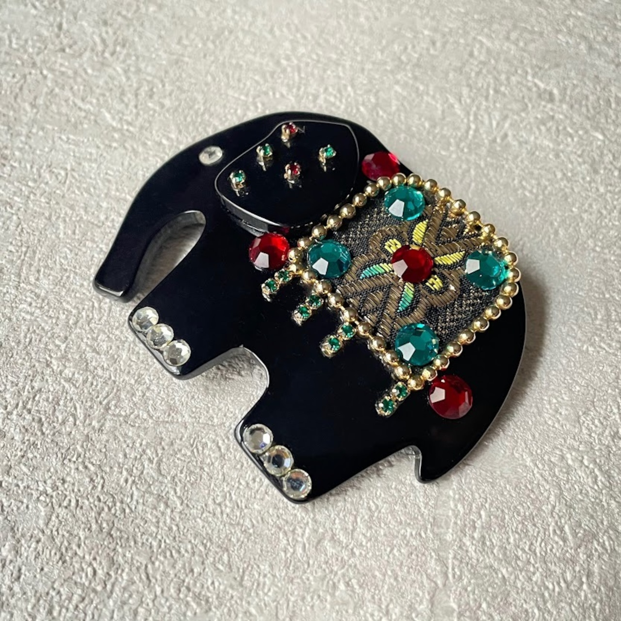 マルチカラーのガラスが魅力のゾウモチーフのブローチです。
