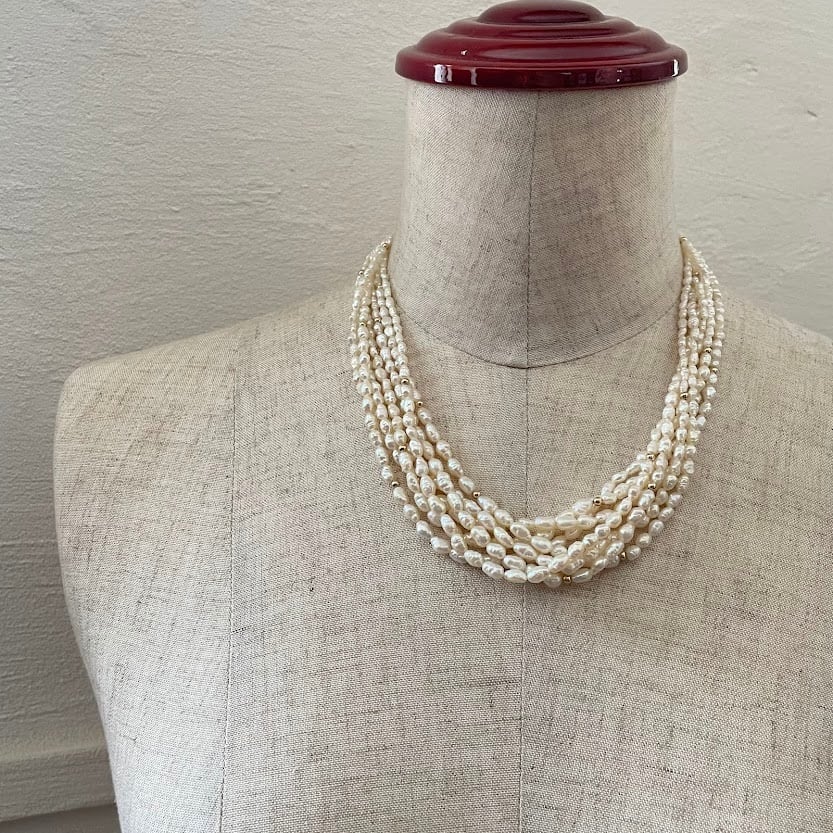 贅沢に使った淡水パールとバラデザインの金具が魅力のネックレスです。