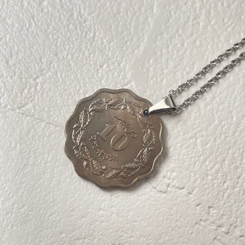 パキスタンで1972年に発行されたヴィンテージコインをリメイクして作られた、ハンドメイドのネックレスです。