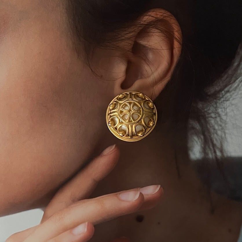 雰囲気あるメタルの透かしにパールを閉じ込めたヴィンテージ感あるイヤリングです。