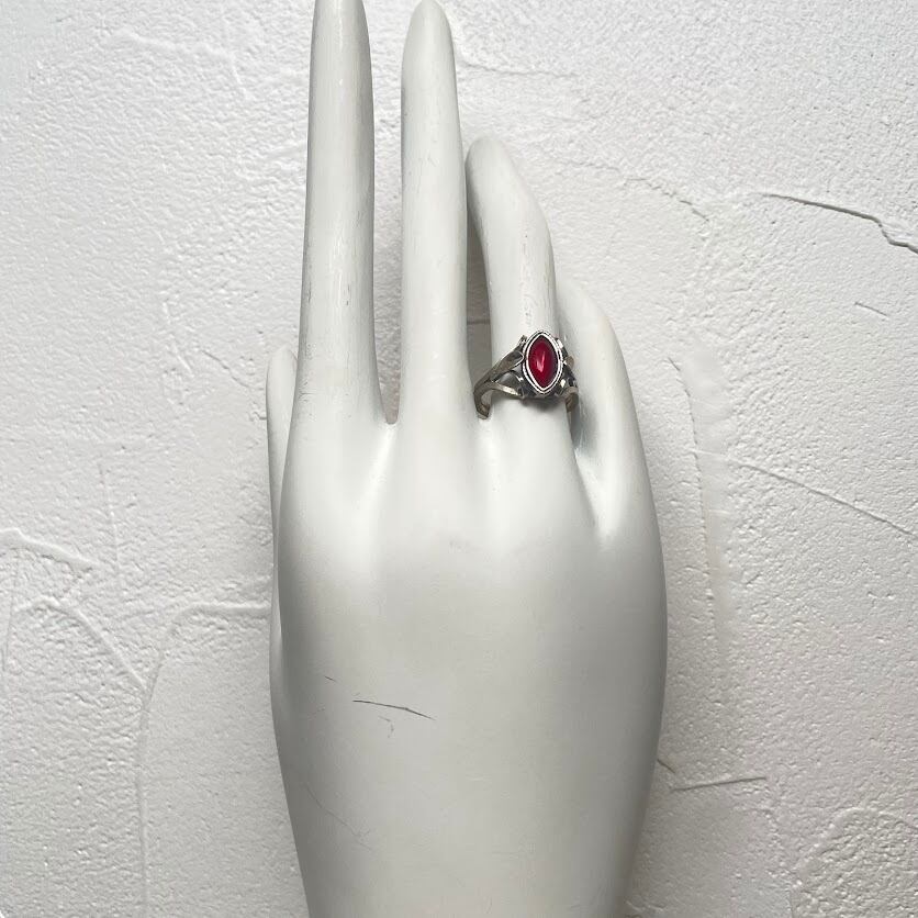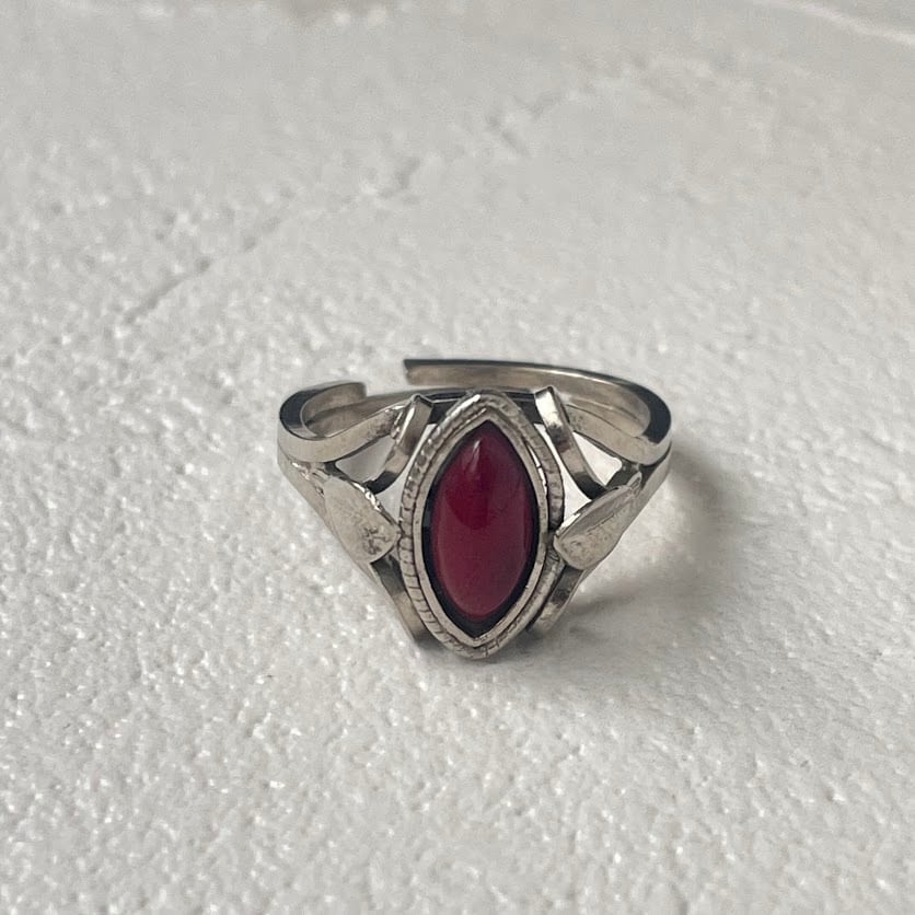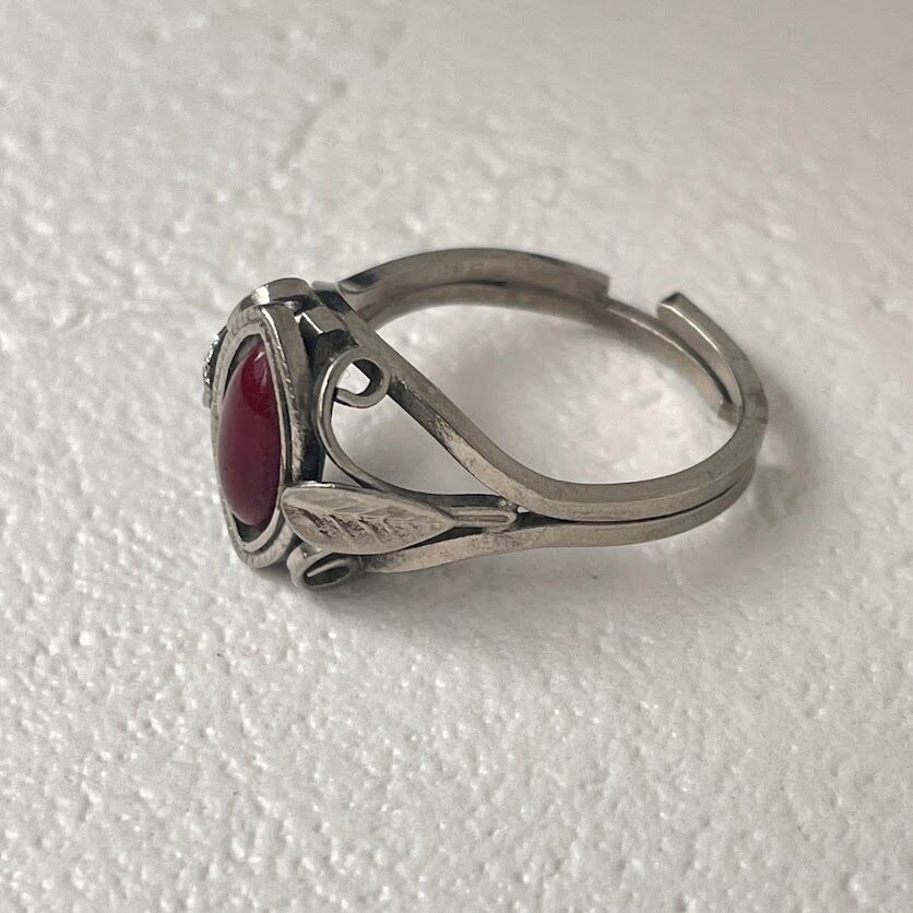深みのある赤い色合いと土台のリーフデザインが魅力のリングです。
