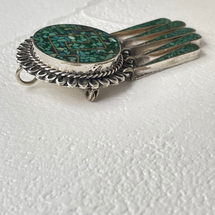 クラッシュターコイズが封入された、メキシコで作られたシルバー925のペンダントにもブローチにもなる2WAYアイテムです。