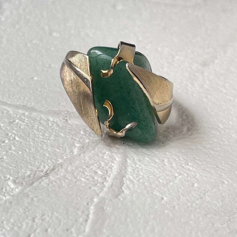 立体的に装飾された金具とグリーンの石が雰囲気あるリングです。