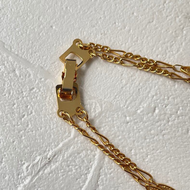 留め具は中留で、折りたたみ式の金具を、もう片方の金具に通しはめるタイプです。