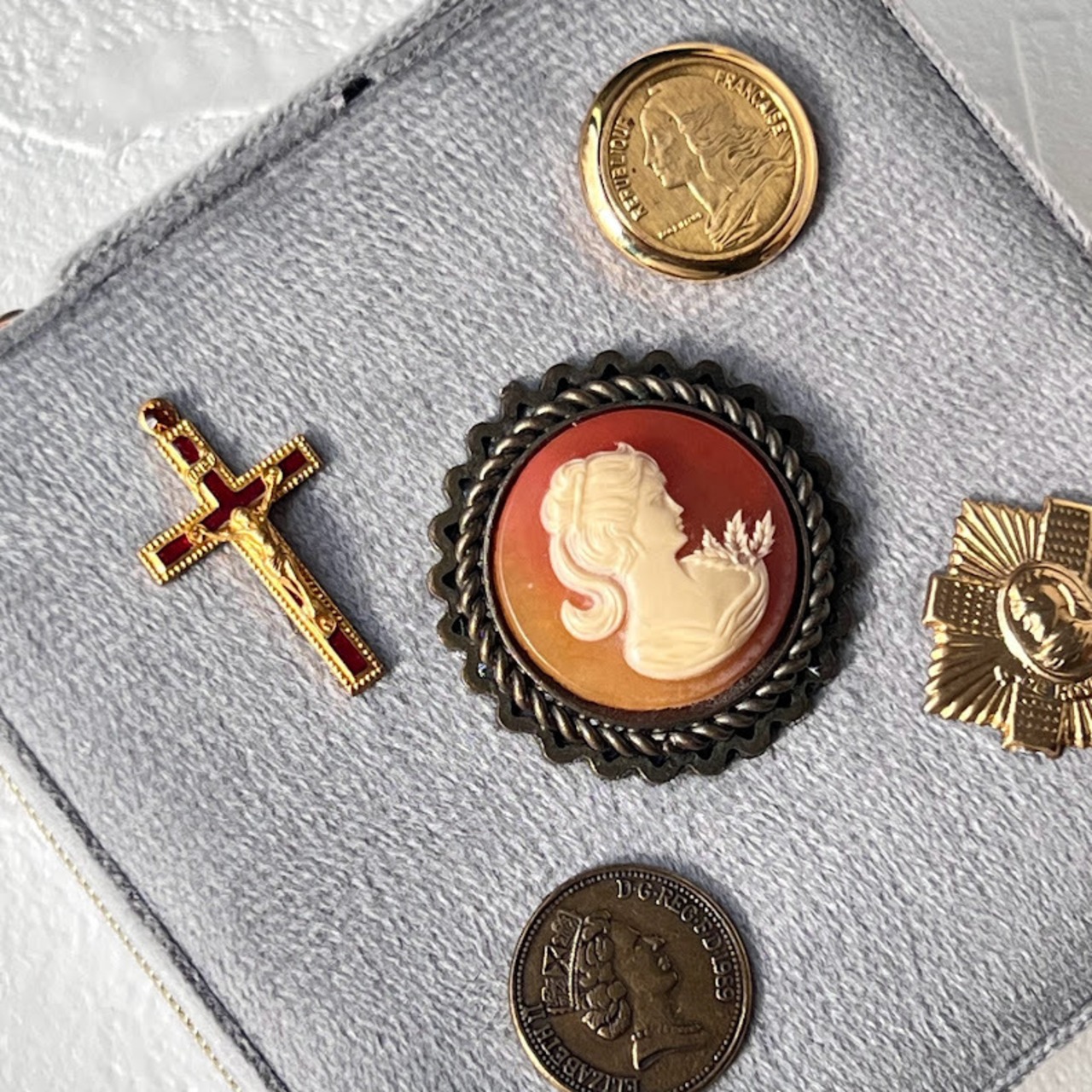 本製品はUSEDブローチのモチーフ部分を装飾として使用しています。装飾部分に強い力を加えたり、無理に押したりすると破損する恐れがありますので、取り扱いにはご注意ください。